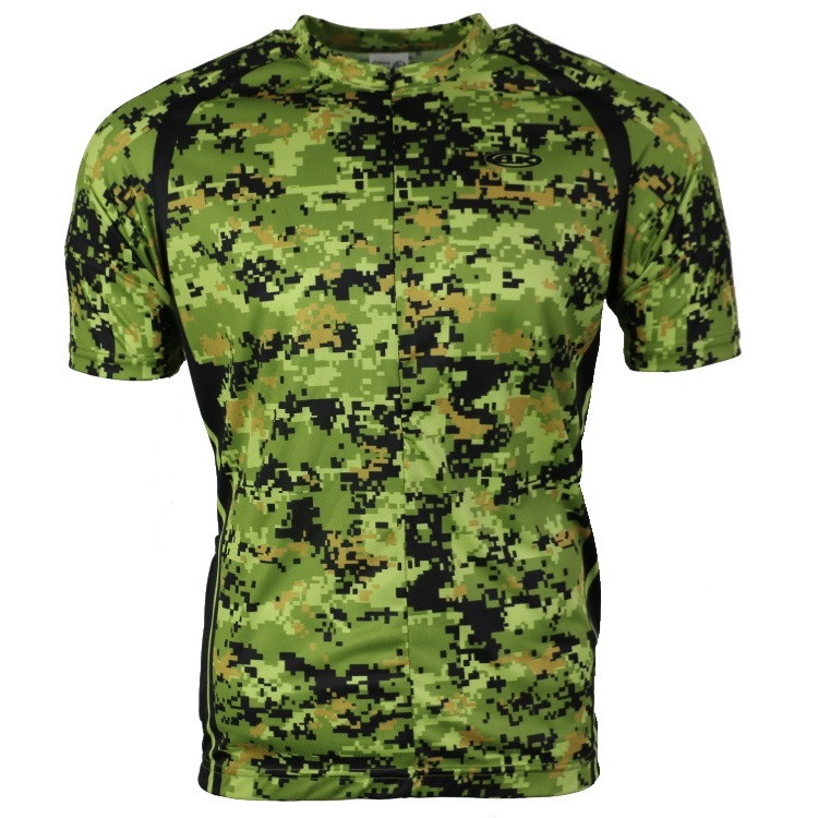 Camo green cycling jersey in a digital camouflage design. Camo green bike jersey has raglan sleeves with half zip up design. Jerseys include a classic 3 pocket back and gripper waist.