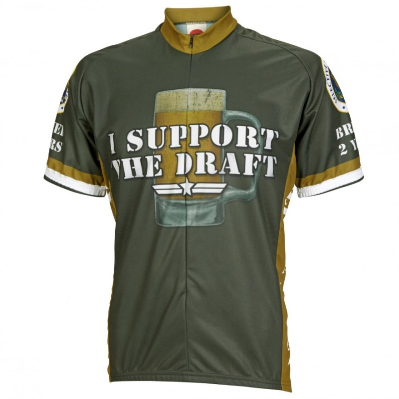 Show your love of country & beer with this I Support The Draft cycling jersey. I Support The Draft bike jersey has retro military inspired design in army green, gold and white. Design includes a draft beer image on front / back and selective service crest with Brewed 2 Years text on the sleeves.